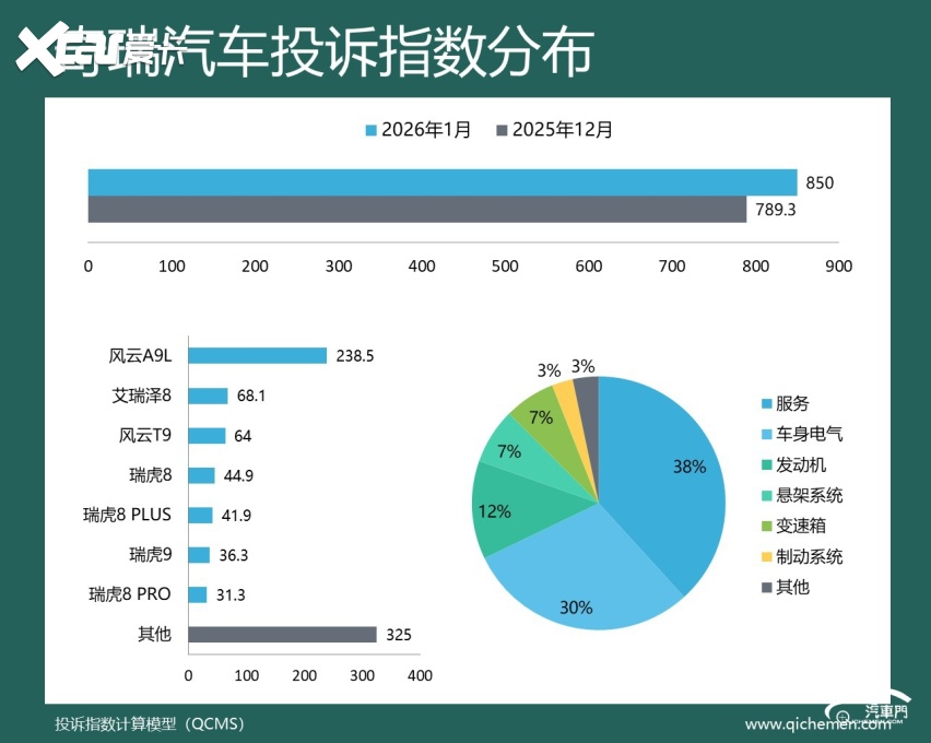 汽车质量投诉点评:1月份,奇瑞汽车的投诉指数小幅回弹,不过并未遇到新的投诉问题。从投诉反馈来看,本月奇瑞的经销商问题投诉较多,不退订金和承诺不兑现问题都遭到了多位车主的投诉。与此同时,承诺不兑现问题车机不升级问题也遭到了小部分车主集中投诉,捷途旅行者和艾瑞泽8是重点投诉对象。