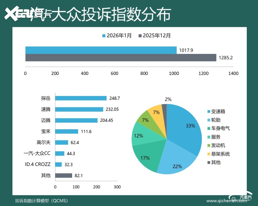 汽车质量投诉点评:去年12月投诉指数大涨的一汽-大众,1月份投诉指数有所下降。但从投诉反馈来看,变速箱机电单元故障仍然被大量车主投诉。迈腾、速腾、CC、探越等多款车型都有大量案例。与此同时,宝来和速腾的轮胎开裂问题本月也再次遭到了众多车主的投诉。此外,还有少部分迈腾、宝来和ID.4车主投诉悬架吃胎偏磨问题,2023款车型是主要爆发点。