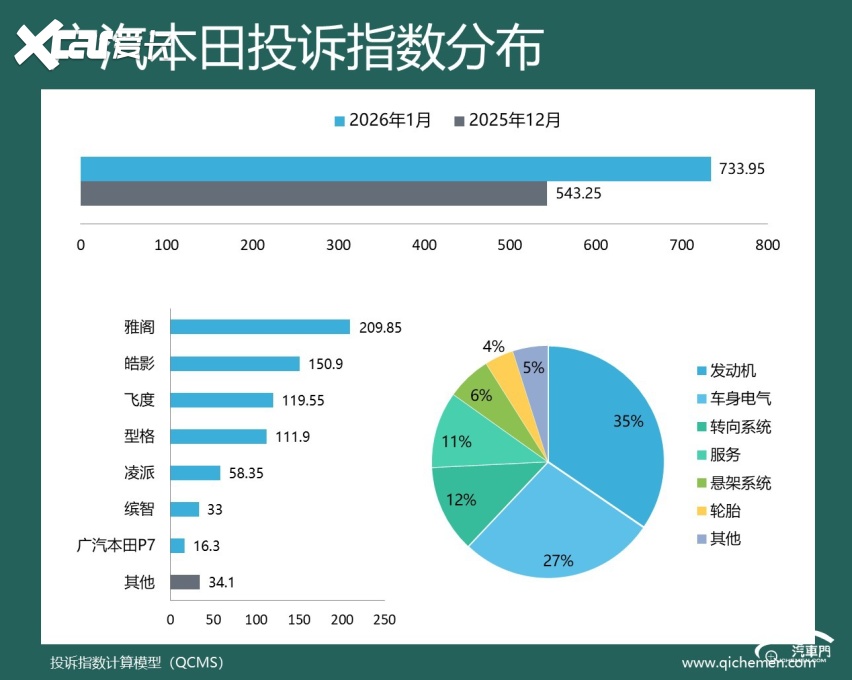 汽车质量投诉点评:上个月短暂缺席之后,广汽本田再次回到了前五名,的投诉指数大幅上升了三成以上。这背后,发动机异响问题成了广汽本田投诉指数大涨的推手,该问题的投诉指数占比接近20%。飞度、锋范、缤智的老车型成了问题重灾区。与此同时,被投诉已久的遮阳帘卡口断裂和转向异响问题也遭到了很多老车主的不满。皓影是主要吐槽对象。此外,雅阁的悬架吃胎偏磨问题也招致了小部分用户的不满。