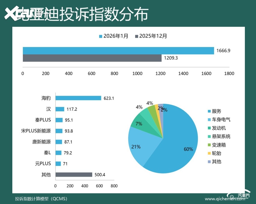 汽车质量投诉点评:2026年开年第一个月,比亚迪投诉指数环比大幅上升了36.86%,重新夺回了投诉“榜首”。这背后,以比亚迪海豹为首的多车车主集体投诉比亚迪未按承诺推送功能升级成了直接推手。据反馈,比亚迪方面宣称支持OTA升级哨兵模式,但迟迟未向用户推送,因此招致了2024款和2024款车型老车主的不满。
