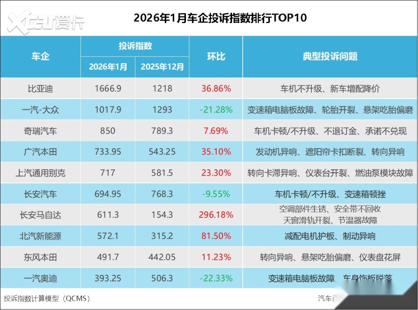 2026年1月车企投诉指数排行:两车企遭遇集中投诉