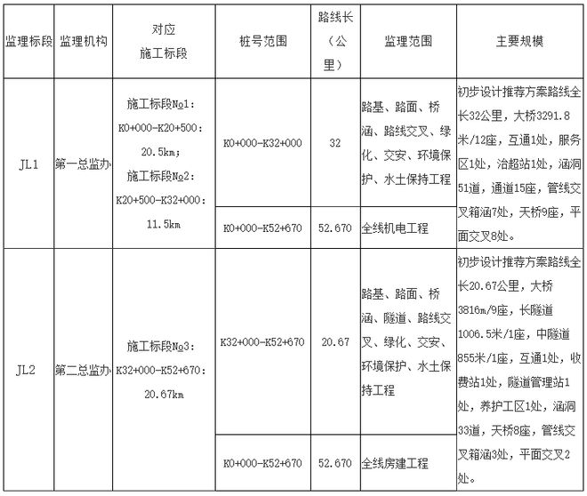 国道108线太原过境段公路新建工程施工监理服务,施工监理共分为2个标段,即JL1、JL2施工监理标段,采用“一级监理机构模式”,设置总监理工程师办公室(以下简称“总监办”),根据项目实施情况配置监理组,总监办设置监理试验室,工地试验室相应的检查项目和抽检频率:按照《公路工程施工监理规范》(JTG G10-2016)执行,主要工程内容见下表: