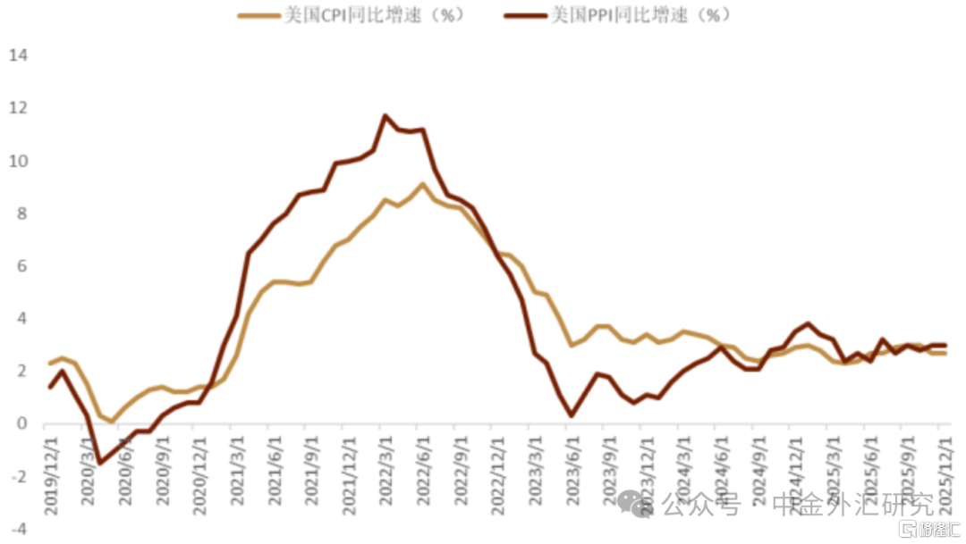 美国通胀上升压力再现1月公布的数据显示,美国12月核心CPI同比增长2.6%,和前值持平,整体CPI同比增长2.7%,同样持平于市场预期和前值,这也使得这一通胀数据在过去的一年内基本维持稳定。尤其值得注意的是,PPI数据则显示通胀明显有所抬升:美国12月PPI同比上涨3%,明显高于市场的预期2.8%,12月核心PPI同比上涨3.3%,同样高于市场预期的2.9%,12月PPI环比录得0.5%,高于市场预期的0.2%,核心PPI环比录得0.7%,大幅高于市场预期的0.2%,以及前值的0%(图表13)。12月PPI环比增速更是创最近三个月来的最大涨幅,核心指标同比增速也是上升至年内高位附近。分项来看,服务成本显著上升,其中贸易利润率环比涨幅为2024年年中以来的最高水平;核心商品价格也依旧呈加速上涨的态势。整体看,通胀近期的走高也带动了市场对美联储今年降息预期的下行。