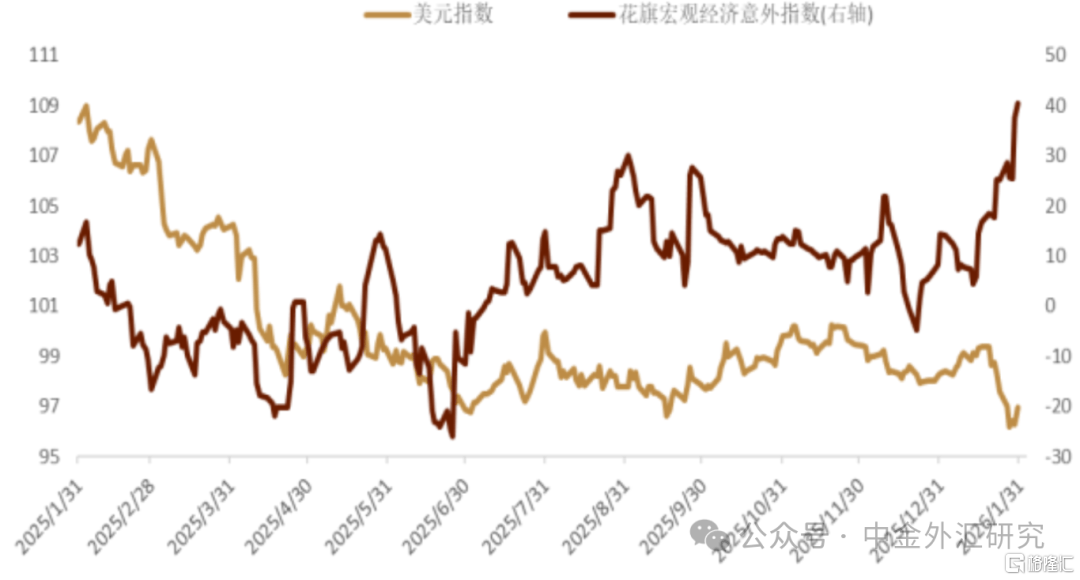 而上周五,特朗普宣布将提名凯文·沃什担任下届美联储主席[8] ,接替5月任期届满的现任主席鲍威尔。沃什长期以立场著称,尽管自去年以来公开支持降息以迎合特朗普,但市场仍认为其不太可能激进降息,尤其相较于哈塞特等其他人选更为。而考虑到沃什曾经在美联储任职期间一贯对通胀保持警惕,并且经常支持更高利率。市场对此做出明显解读,美元也在最近两个交易日出现反弹。向前看,我们认为美联储主席人选的落地可能会对美元产生一定支撑,而1月月内美元下跌的最大推手:特朗普对外政策的不确定性也被市场有所定价,这可能意味着美元在2月可能会有所企稳。