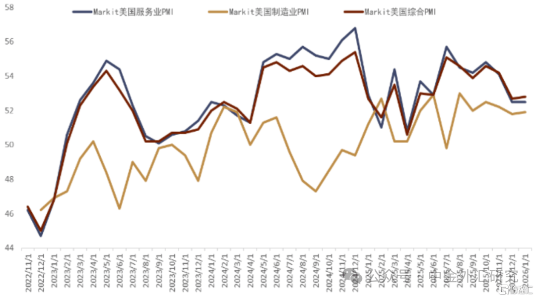 1月公布的美国经济数据整体较强虽然此前市场对美国经济一度存疑,但1月公布的经济数据却依旧展示出韧性:劳动力市场方面,截至1月24日当周的首次申领失业救济人数下降至20.9万,低于市场预期的20.5万。而截至1月17日当周的总体持续申领人数则减少了3.8万至182.7万,略低于2025年同比周的184.9万。这可能表明劳动力市场整体状况可能在趋稳。而标普全球公布的1月的最新数据显示,美国企业活动在1月整体维持强势:1月综合PMI初值录得52.8,略高于前值的52.7。制造业PMI初值录得51.9,同样高于前值的51.8。而服务业PMI初值录得52.5,和前值持平(图表14)。总体看,美国经济数据在2026年1月的表现整体限制了美元的下行幅度,而从花旗宏观经济意外指数来看,虽然美国经济的较强表现近期和美元走势出现了分化(图表15),但我们认为如果经济数据继可以在2月延续近期的势头,那么这可能会帮助美元有所企稳。