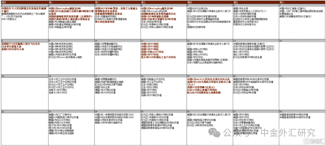 其他非基本面因素美元指数连续第三个月走弱,从1月16日高点算起,美元在1月的最深跌幅一度达到约4%。非基本面因素或是美元1月走弱的主因,从达沃斯论坛上美国总统特朗普就格陵兰问题威胁对欧洲国家征收关税,到加拿大和韩国遭受关税威胁,再到纽约联储就日元汇率向金融机构询价和特朗普接受采访时对弱美元持开放态度。短短一周多的时间内,密集而连续的利空令美元遭受了广泛的抛售并跌破了多个重要的技术关口。直到凯文沃什将被提名为美联储主席的消息传出后,美元才开启了力度稍强的反弹。进入2月,我们认为非基本面因素仍旧会在一定程度上影响汇市,值得关注的风险事件包括伊朗地缘风险、日本当局对日元汇率的潜在干预以及美国最高法关于对等关税的判决落地等。