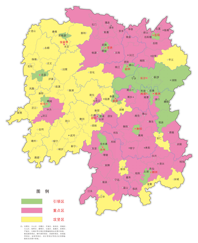 引领区:主要指城镇化率在80%以上或农村居民人均可支配收入在25000元左右的县市区,市州内如没有达到此标准的县市区则各列入一个城镇化率最高的区市,共31个。