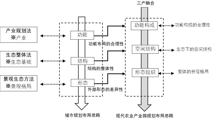 结构、形态。通过三个要素之间的相互作用,共同形成城市的总体布局。城市功能是城市的发展的内动力,城市长远发展的基础;城市结构是城市构成的主体,强调事物间的联系,分为非物质结构和物质结构两方面;城市形态是城市的空间表象的特征,整体和内部组成部分在空间地域的分布形式。借鉴城市规划总体布局的三要素,提出现代农业产业园的规划设计的总体思路功能构成—空间结构—形态组织以此来进行现代农业产业园的。