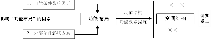 空间结构是对功能构成的进一步研究,是回答 “怎么做”的问题。空间结构和功能布局是相互支撑的关系,以影响功能布局的因素入手,提出自然条件影响因素+外部条件影响因素,统筹协调空间结构。