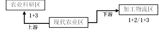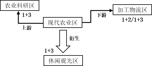 现代农业产业园的核心功能是现代农业区,围绕现代农业区向产业链的上游延伸形成以现代农业园区生产功能为主的农业科研区,下游延伸形成以现代农业区的农产品为主的加工物流区,与国家文件中提出的建设“生产+加工+科技”的现代农业产业园的提法相吻合,形成园区的主体功能区。