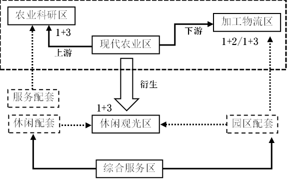 功能构成是建立在产业体系的基础之上,根据产业之间存在着主导和衍生关系,因此,其所属的功能区之间也存在着相应的关系。将现代农业产业园的功能区分为主体功能区、衍生功能区和配套功能区,以不同功能关系去引导功能区的划分。