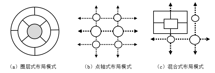 现代农业产业园的空间布局主要是“点—线—面”各项要素的空间安排,根据不同的要素组合形成园区的空间布局模式。通过对国家级现代农业产业园的空间结构研究,结合朱绪荣《国家现代农业产业园规划与方案编制方法及案例》提出,比较常用的有圈层式、点一轴式和复合式三种空间结构