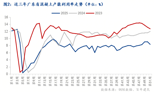 2025年1-11月,广东省房地产新开工面积为3695.76万平方米,同比下降19.5%。分类型来看,商品住宅新开工面积为2581.06万平方米,下降16.2%;办公楼新开工面积为192.29万平方米,下降27.3%;商业营业用房新开工面积为249.11万平方米,下降20.4%。从行业反馈来看,现如今房建需求依旧不乐观,企业表示大湾区基建与城市更新等大方向项目存在一定体量,但是是否能释放并不明朗,补缺房建量不足,因此整体量或略有下降。混凝土企业也在资金回款不理想,市场利润不足的条件下,逐步收缩整合。