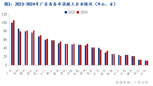 据统计,2024 年广东省共有预拌混凝土生产企业1026家,比2023年的1008家增 加了14家,同比增幅为1.79%。2024年广东省的粤北地区预拌混凝土生产企业数量 增幅最高,同比增幅5%,粤东、珠三角和粤西地区同比增幅分别为 2.59%、1.34%和0.58%。其中广州、湛江、肇庆、韶关新增量排名前三,而深圳、云浮、中山三地搅拌站数量减少,其中深圳最多,减少6家。整体数量呈增势,市场下行趋势,但是投资依旧偏积极,导致产能继续增加。