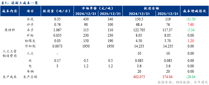 2025年同比2024年,广州市混凝土生产成本较大幅下降,在不考虑车损、人工以及水电变量的情况下,平均每方C30混凝土生产成本下跌28.04元。百年建筑网统计2025年广州C30非泵市场成本均价为374.04元/方,年同比下跌6.97%;从生产成本端来看,水泥降幅最大,主要由于目前广州水泥市场属于输入型,广东本地、广西、北方、湖南等地均流通于珠三角市场,由于近几年市场需求严重萎缩,企业间及贸易商间竞争越发激烈,导致市场高价难有支撑,价格持续回落趋势,而其余建材则震荡运行为主。