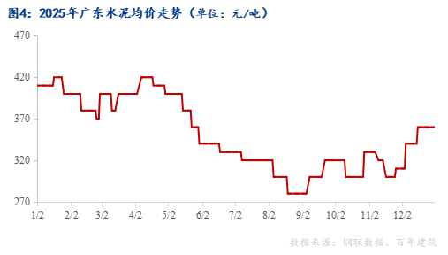截至12月31日,广东主流品牌C30混凝土均价为322元/方,年同比下跌8.65%。由图看出,2025年广东省混凝土走势偏弱运行为主。主要由于今年房建市场依旧萎靡,加之市场资金状况不算乐观,多数企业表示回款较弱,因此新项目启动积极性较低,启动的付款条件也可能较为苛刻,因此市场供需双方积极性较低。年底时段,水泥、砂石、矿粉等原材价格受供需影响,持续上扬,导致混凝土成本增加,价格也是随之小幅上行。