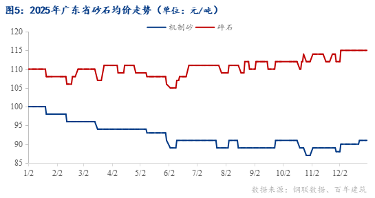 截至12月31日,广东主流品牌机制砂中砂报94元/吨,年同比下跌14.89%;主流品牌16-25mm碎石报106元/吨,年同比下跌11.32%。今年广东砂石市场价格下行趋势为主,新项目启动不足,市场需求疲软,企业内卷严重,外围输入竞争刺激更为激烈,导致全年市场价格上行落实不稳,价格屡屡探底。